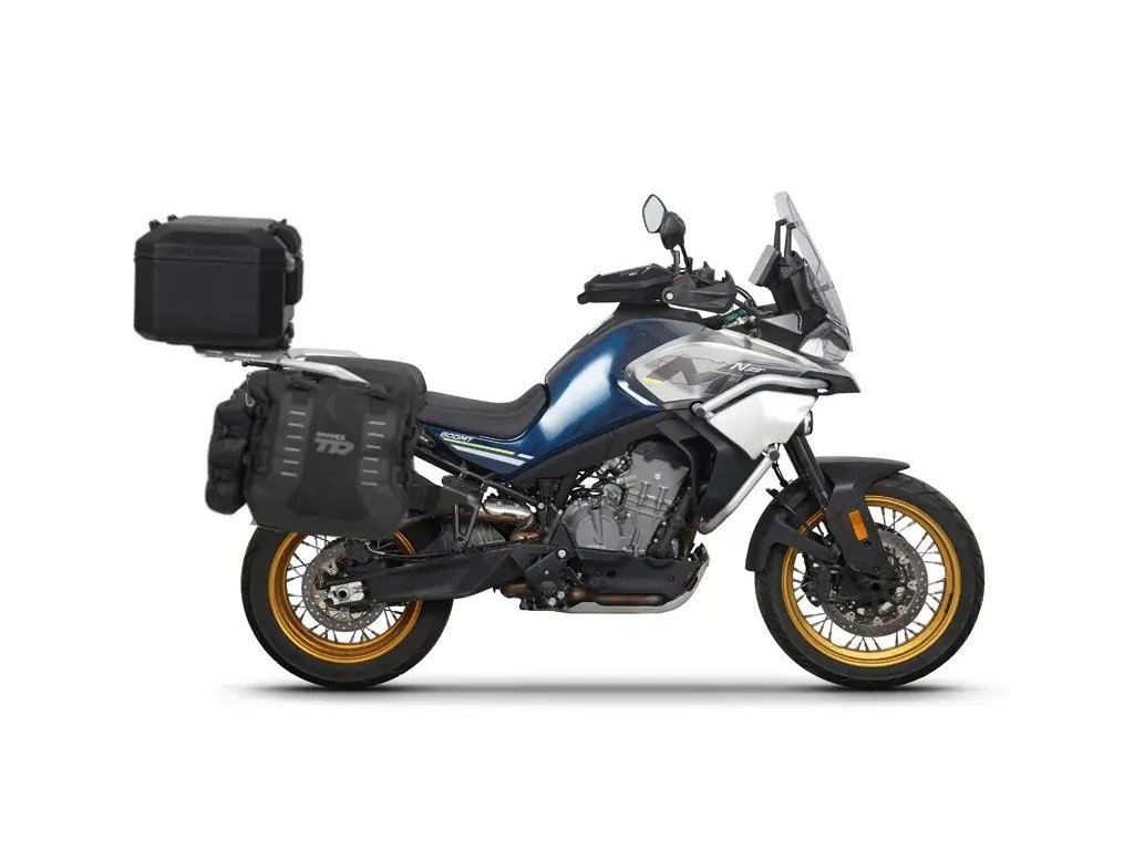 This configuration is designed for maximum carrying capacity on the CF Moto 800MT, combining the advantages of a solid aluminum topcase with flexible side bags.