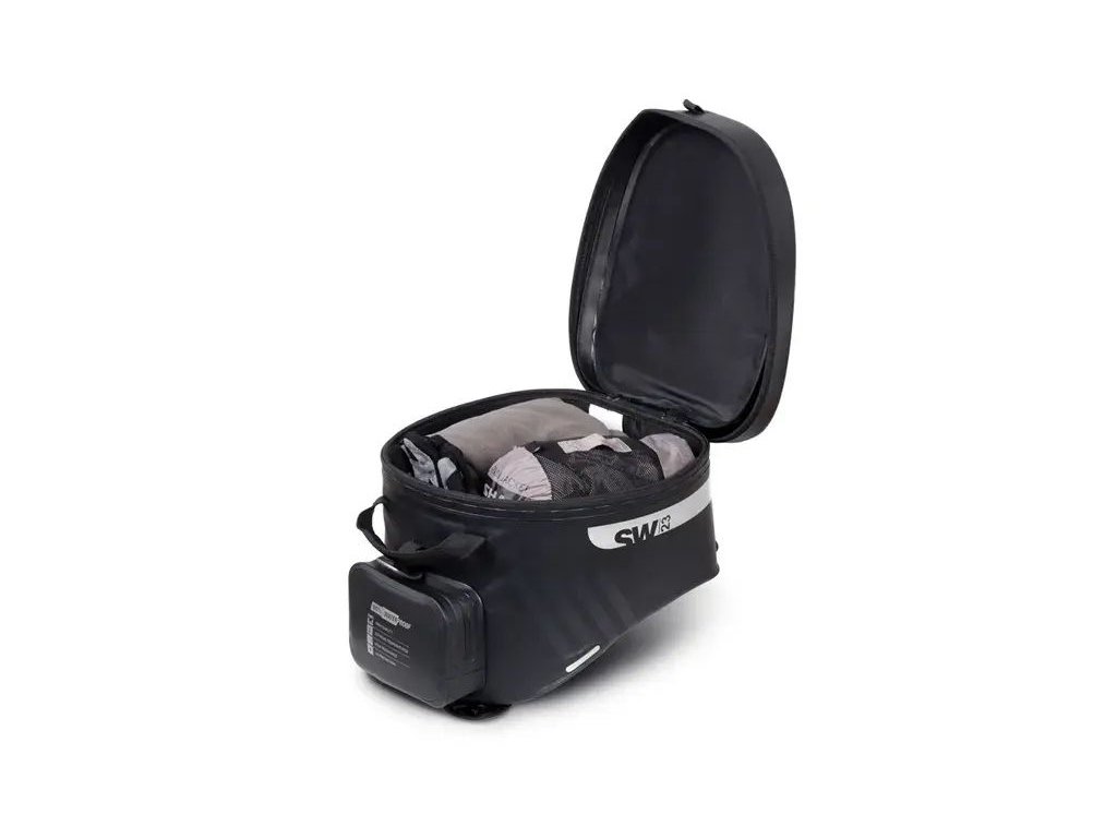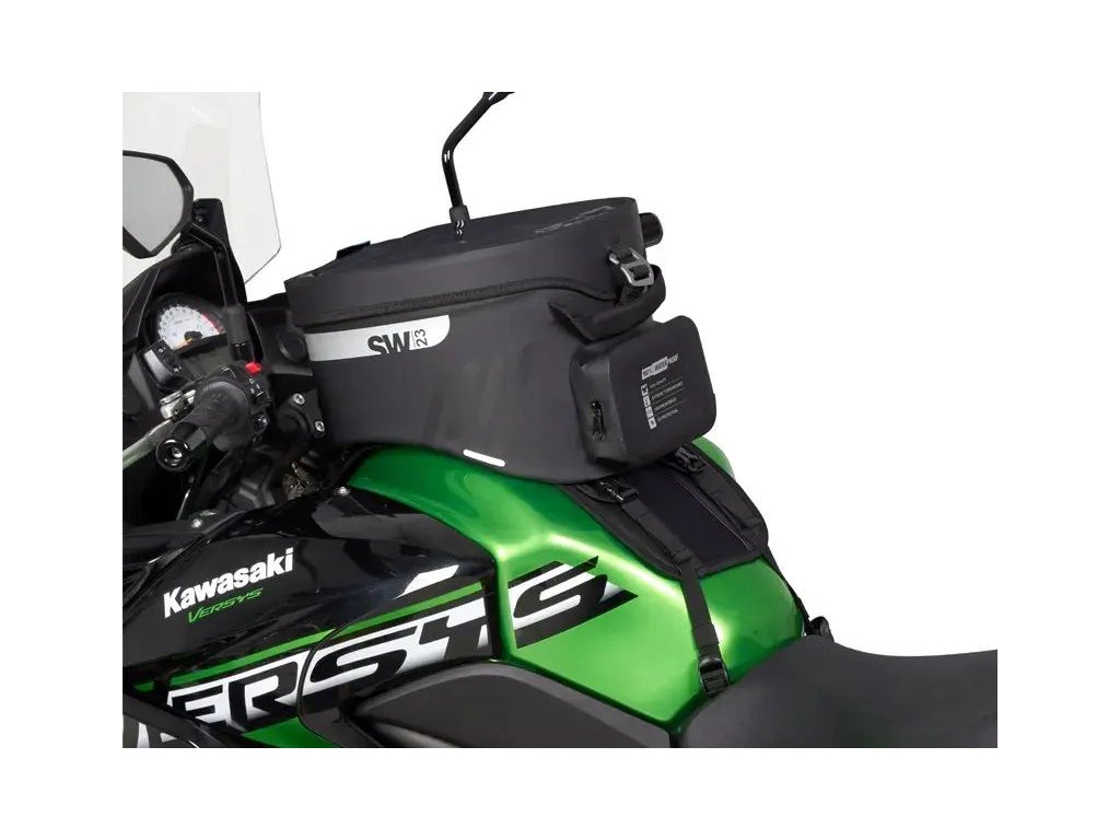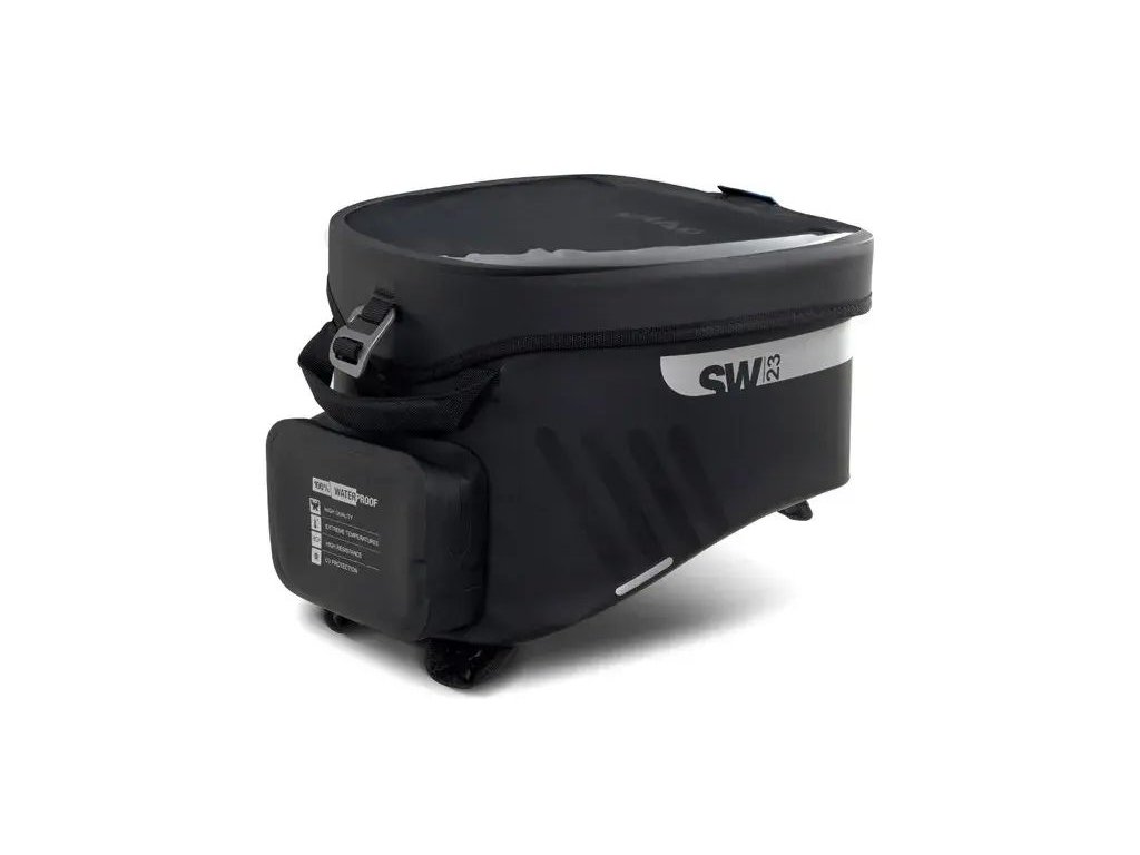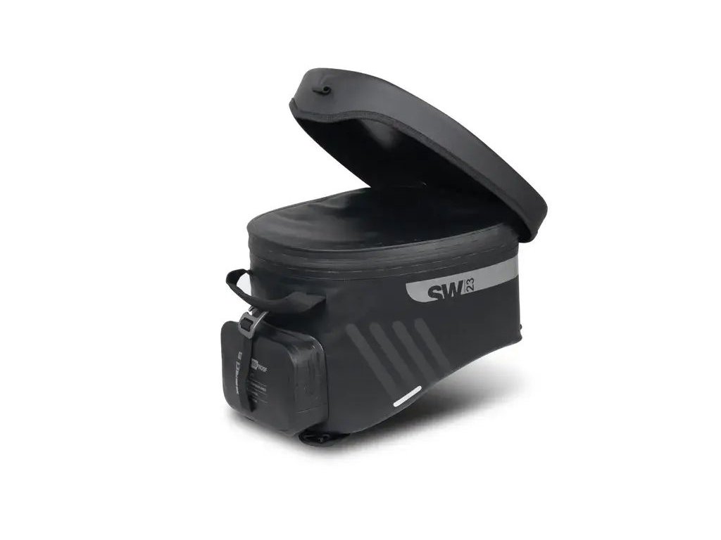 The SW23B Waterproof Tank Bag features a 14-liter capacity and a universal strap system for installation on both plastic and metal tanks. For metal tanks, an optional 4-point magnetic system is available (Ref. X1SL11). Thanks to its overlapping flap that completely covers the water-resistant zippers, the main compartment is fully waterproof, ensuring all your valuables stay protected.